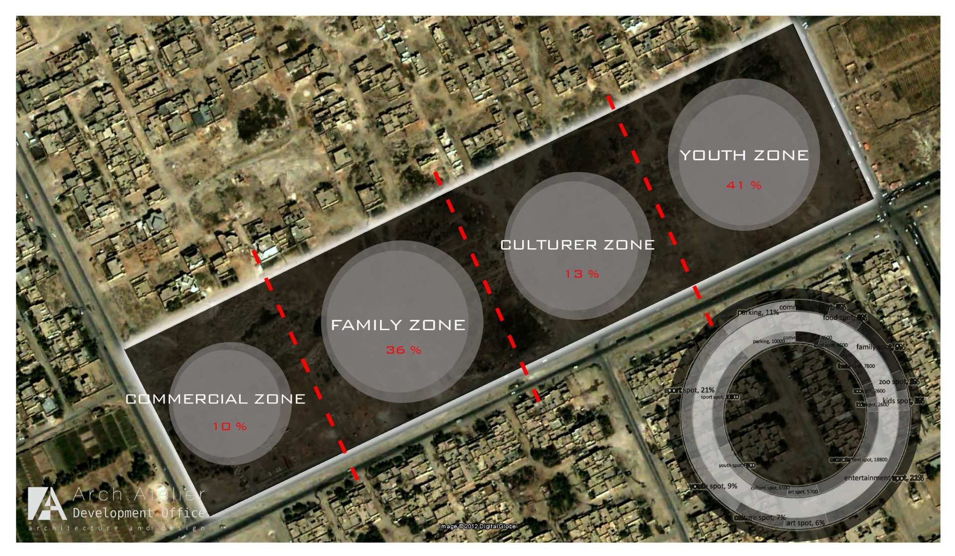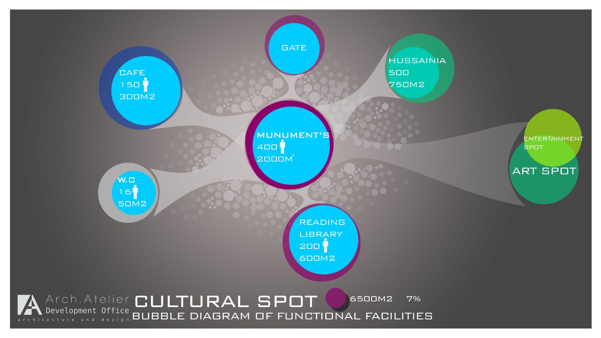 • The culture zone: It has an area of about 6500m², this zone reflects the connection between the past and the future with the big central dome surrounded by the palm trees, and the big cultural library.