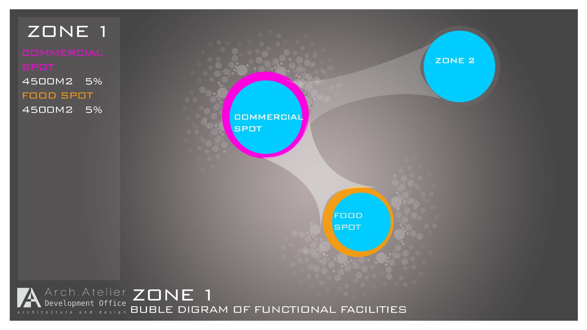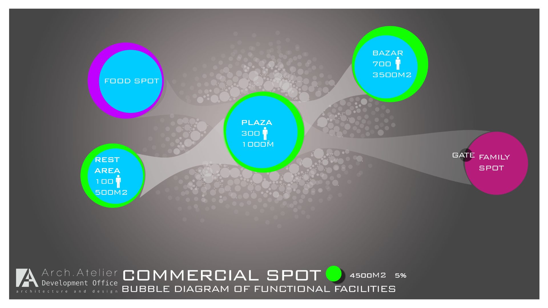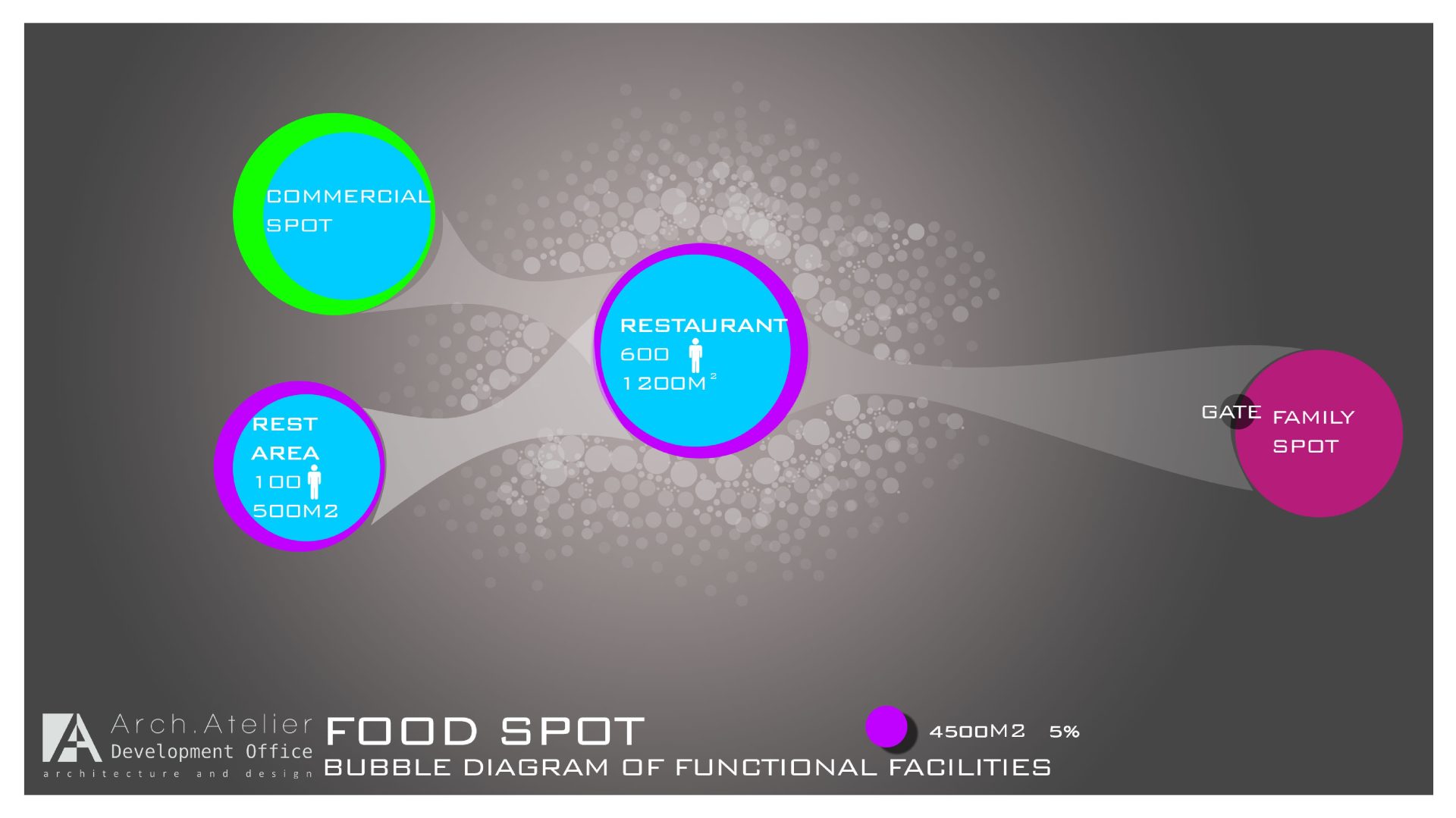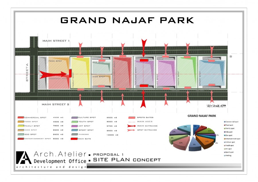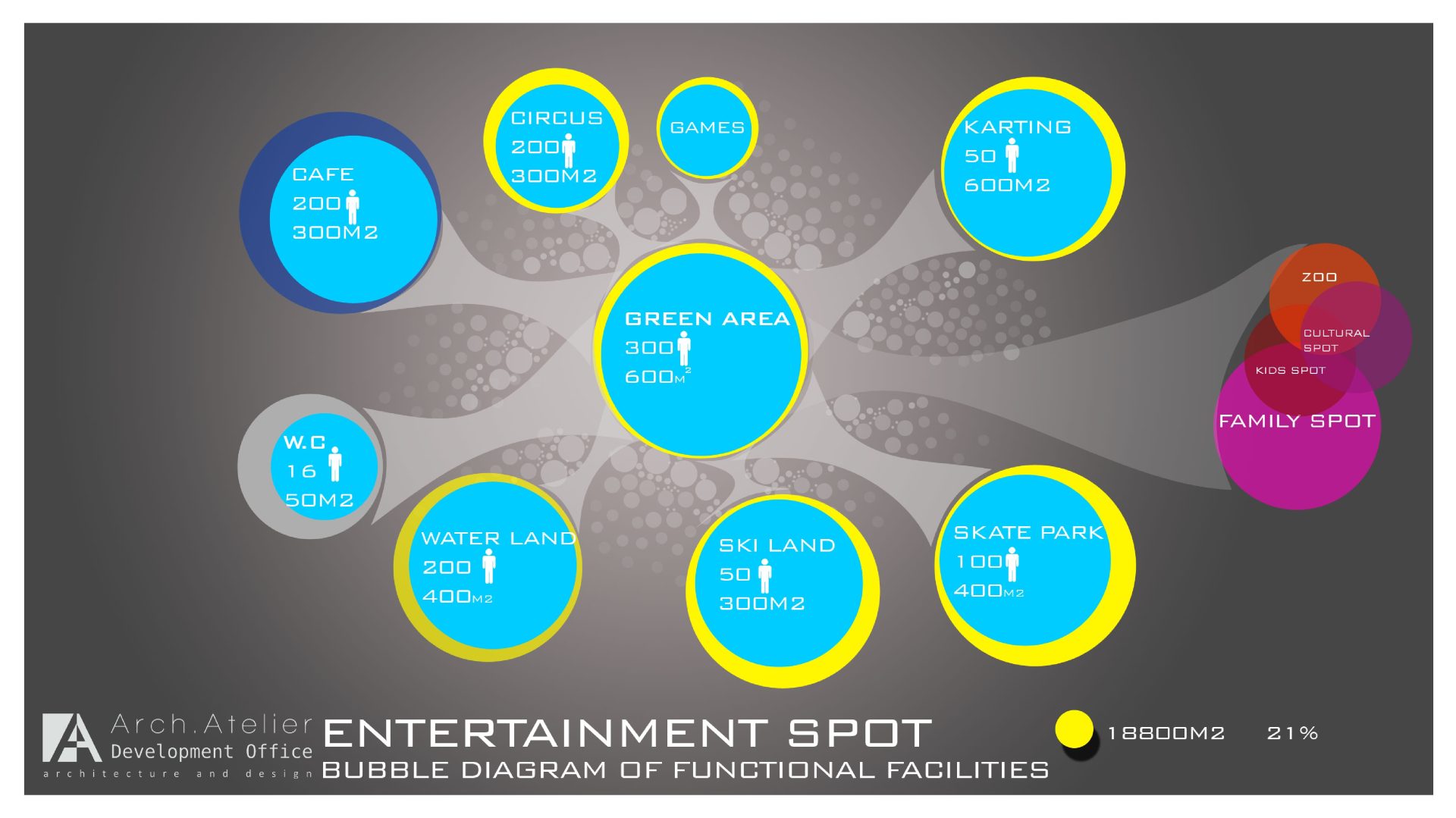 • The food zone: linked to the family zone and the commercial zone, about 4500m². It includes a big restaurant with wide façade of glass.