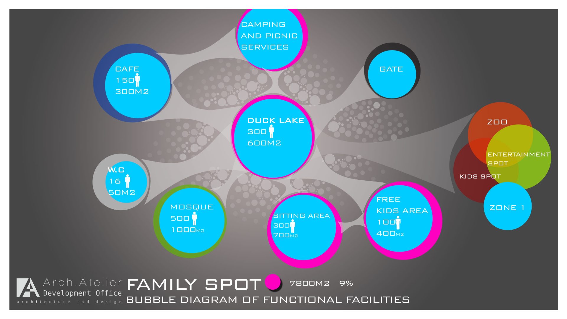 • The family zone: links the food zone, kids’ zone and the zoo. This zone is about 7800m² with a big café, kids playing rooms, camping zone and the central duck lack.