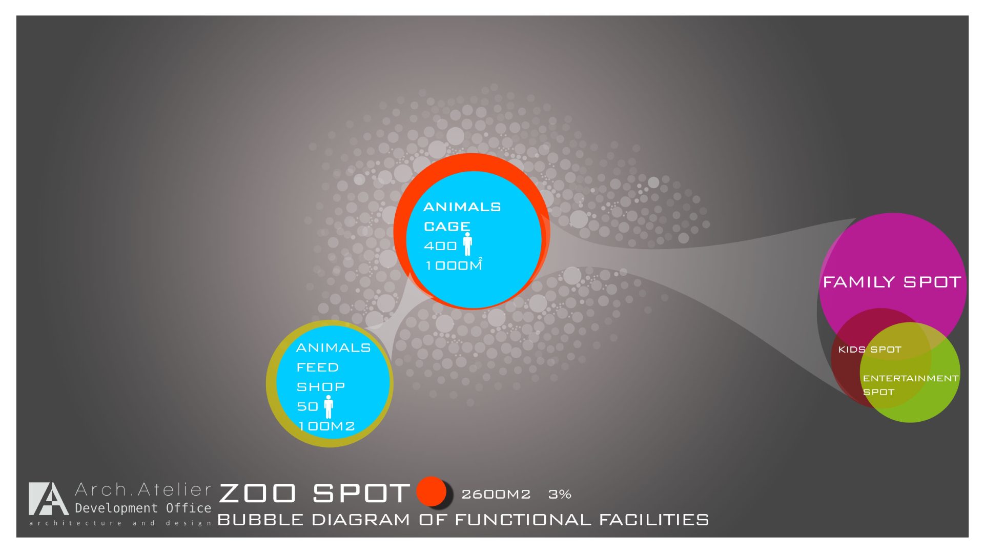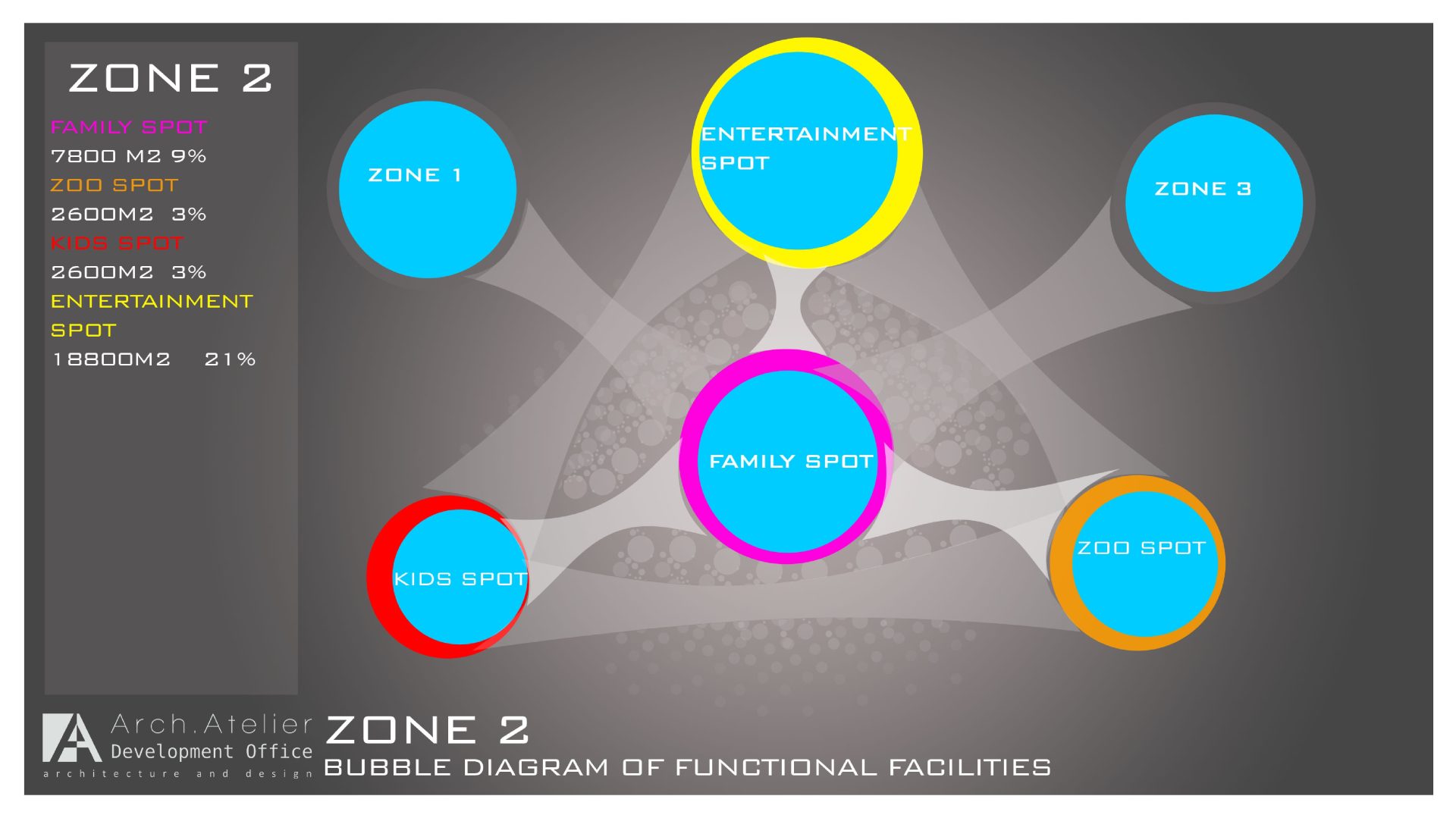 • The kids’ zone: links the family zone, the entertainment zone and the zoo. The zone is about 2600m², and was intended to attract kids by providing vivid colors, interesting design and special events.