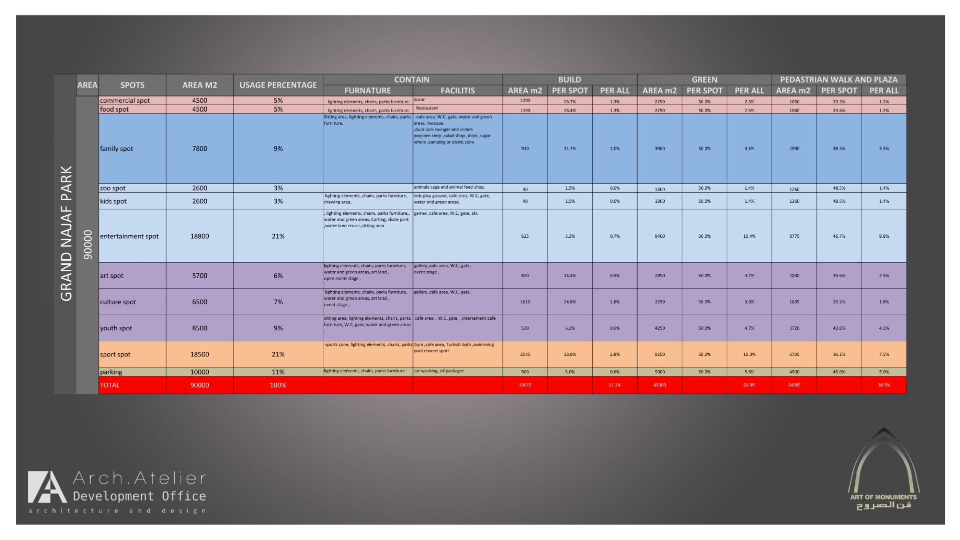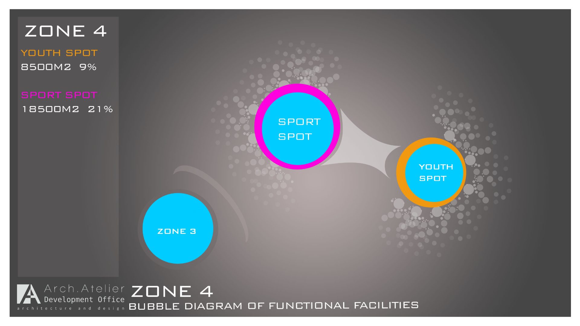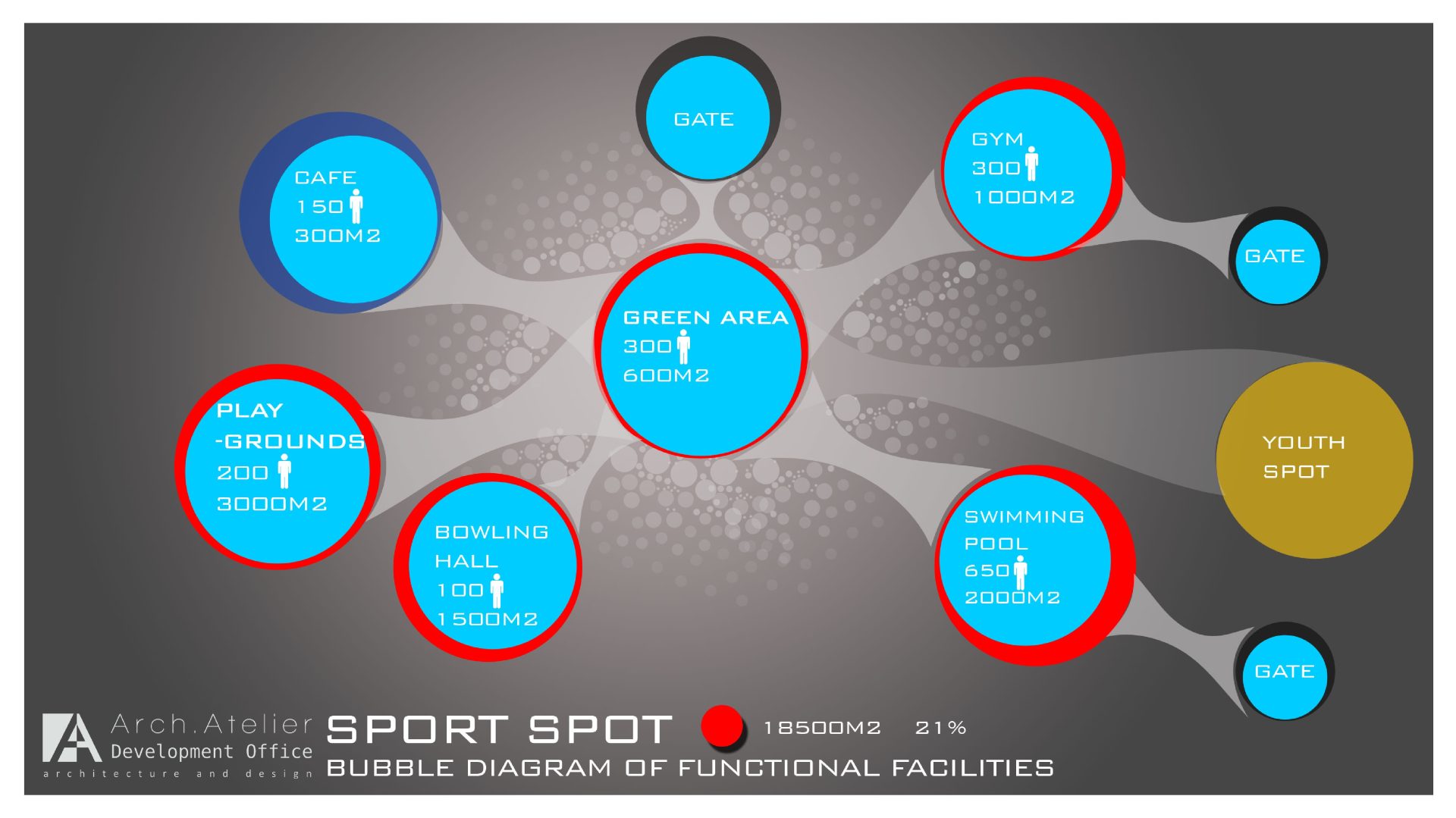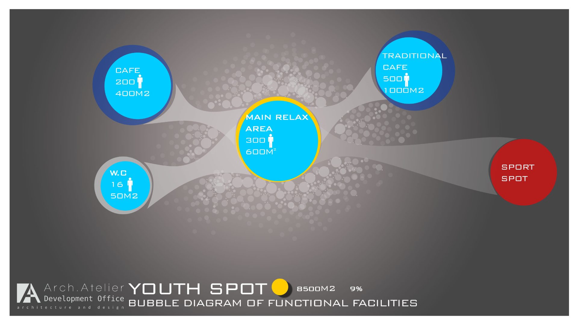 • The Youth zone: linked to the sport zone, it has an area of about 8500m². The challenge about this zone was to design it to fit the youth spirit and we solve it by using the right colors and the furniture.
