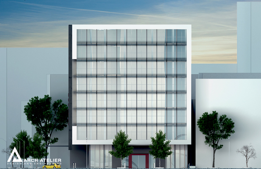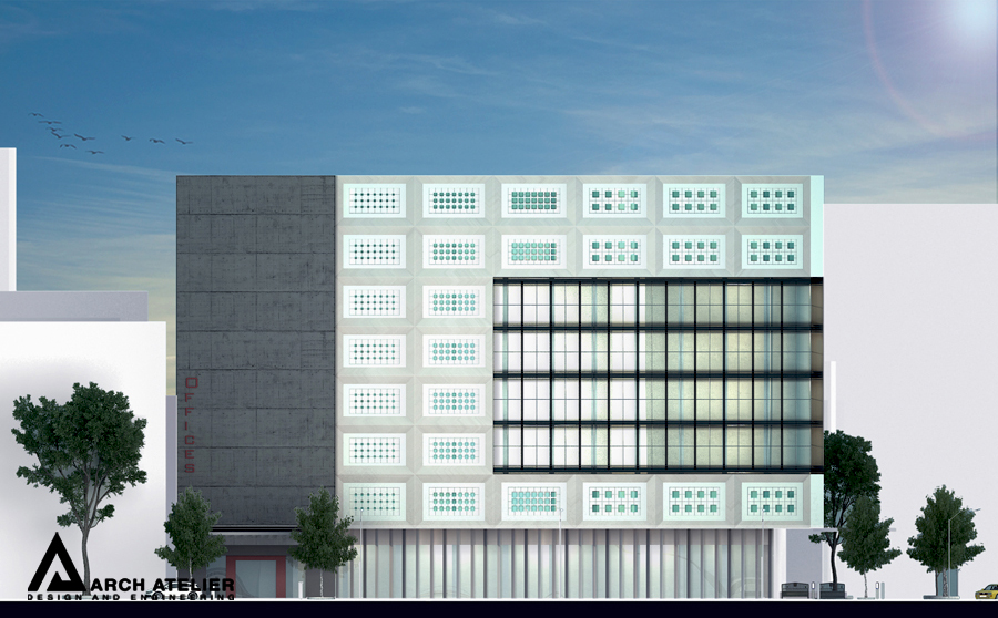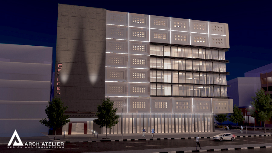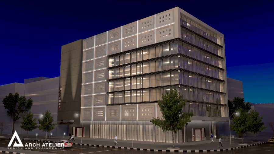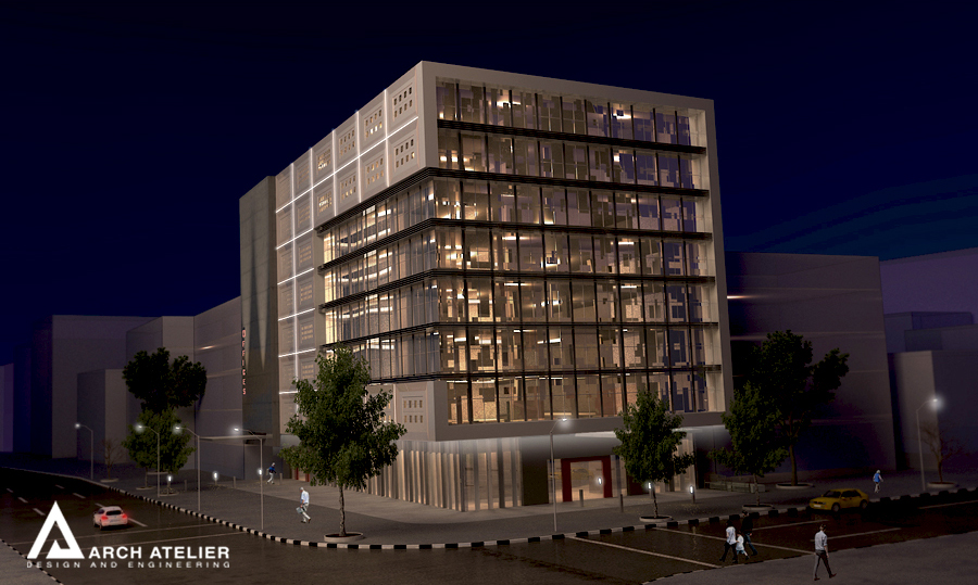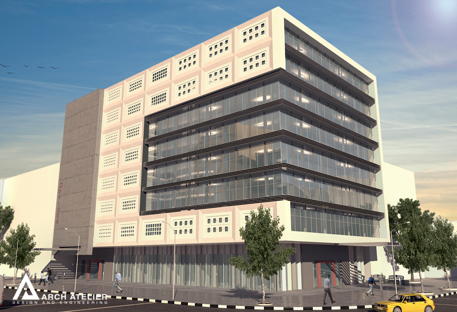 The project is located in Bagdad. Iraq. The proposed building is a 6 story of offices, stores, assembly halls in addition to a cafeteria and required services. The main elevation has large windows while we put a pattern on the rest of the elevations to show the history of the city and to prevent direct sun from entering the building causing high temperatures but allowing at the same time maximum use of day light.