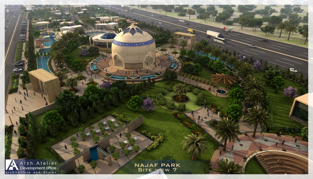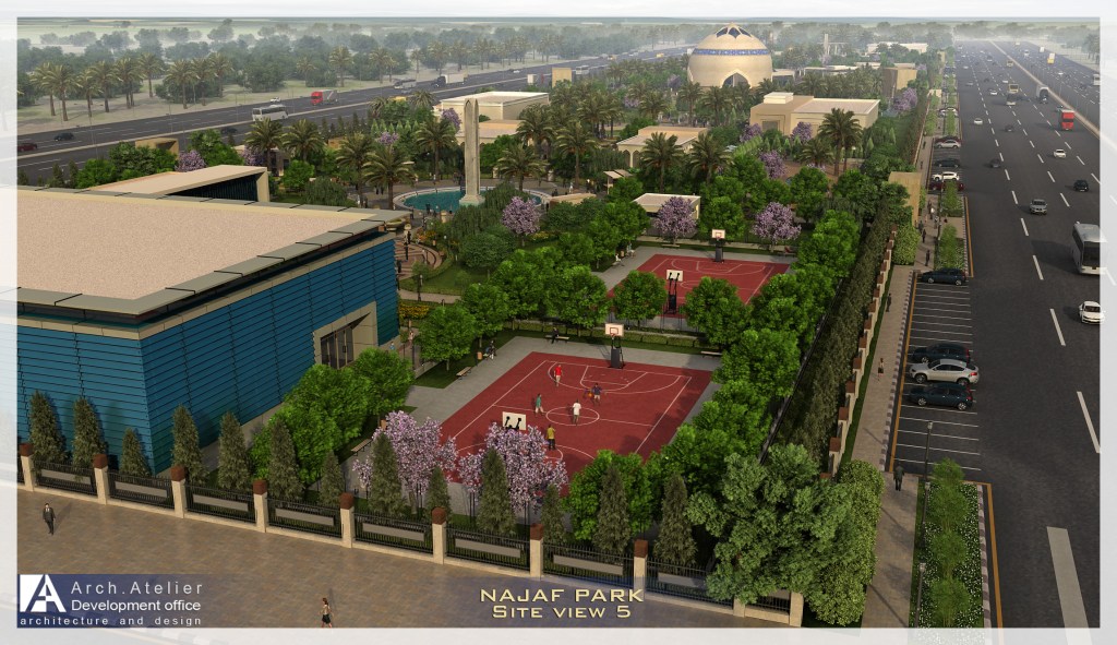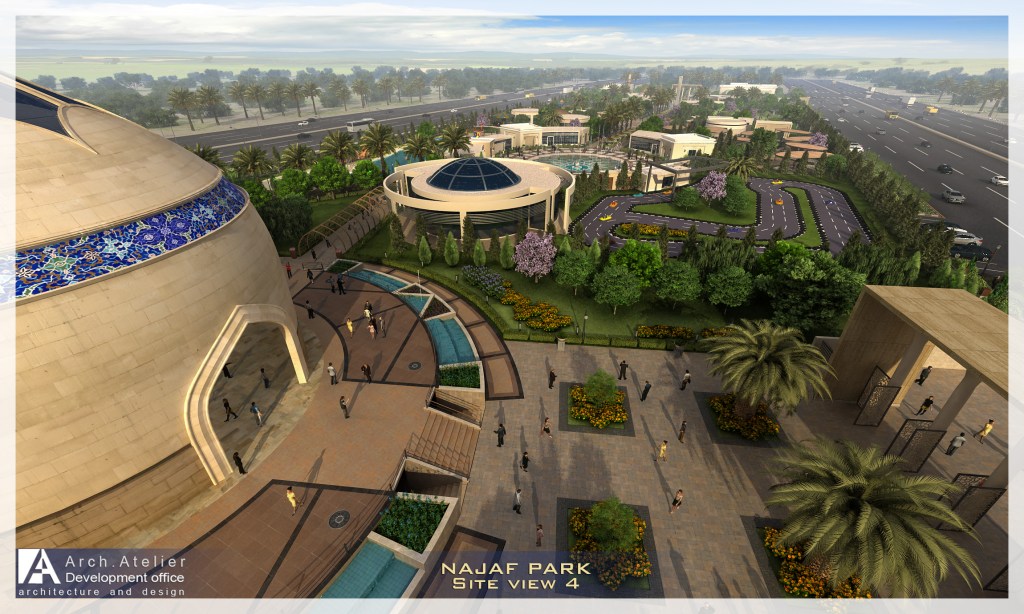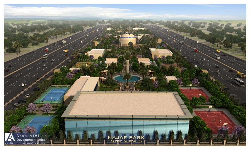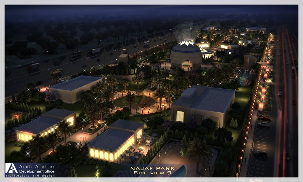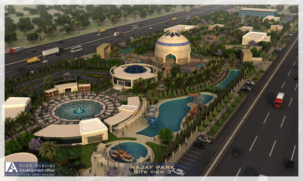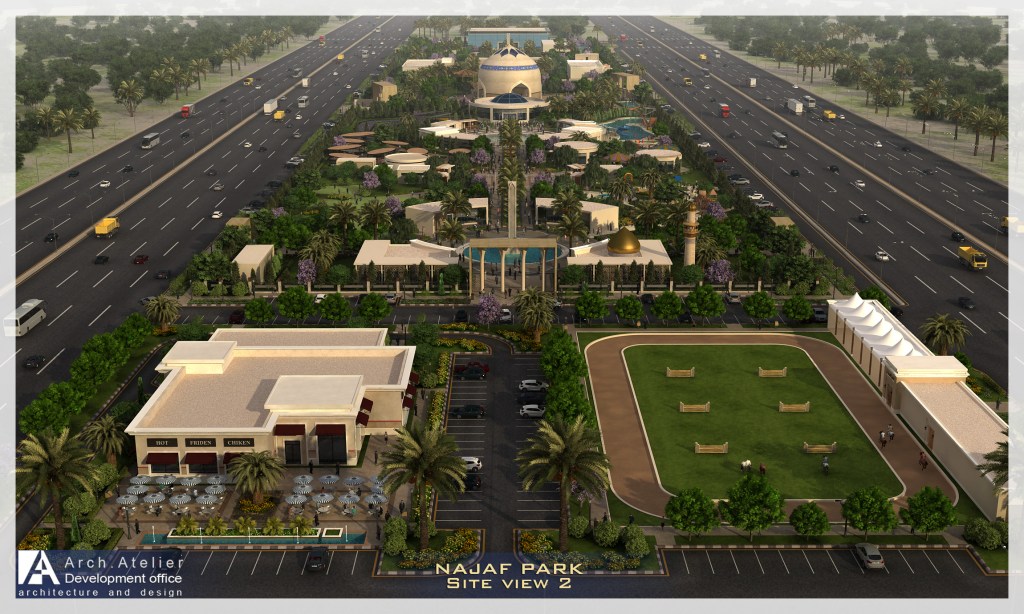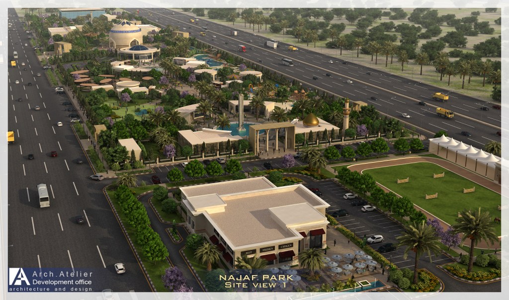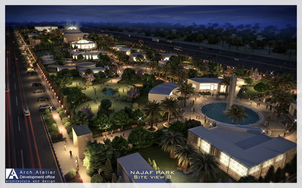 The grand Najaf Park is a land mark of landscaping and a very important touristic attraction located in Iraq on the northern side of al Najaf with a total area of about 90,000 m2. The main concept was to divide the land into several zones; each one has its own distinguished features and all zones are linked to one another. This project was designed to accommodate all ages, to emphasis the relationship between man and nature, to push the urban design to a new level and offer the city an icon that symbolizes it. The zones include: commercial zone, food zone, kids zone, zoo, entertainment zone, cultural zone, art zone, youth zone, sport zone, the horsemanship.