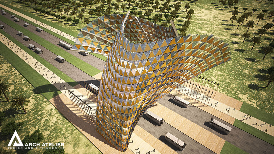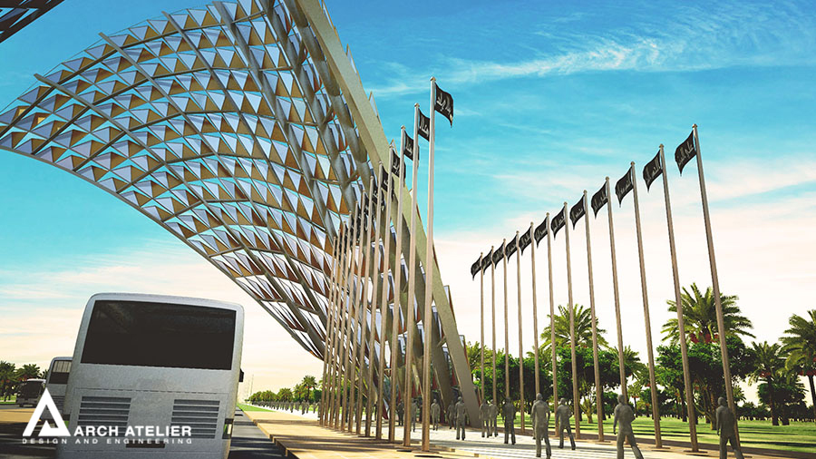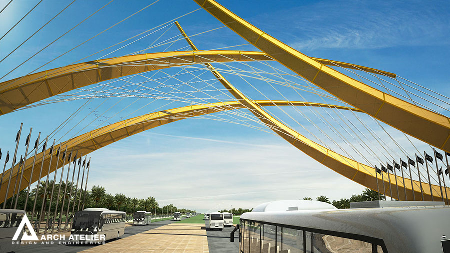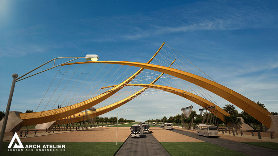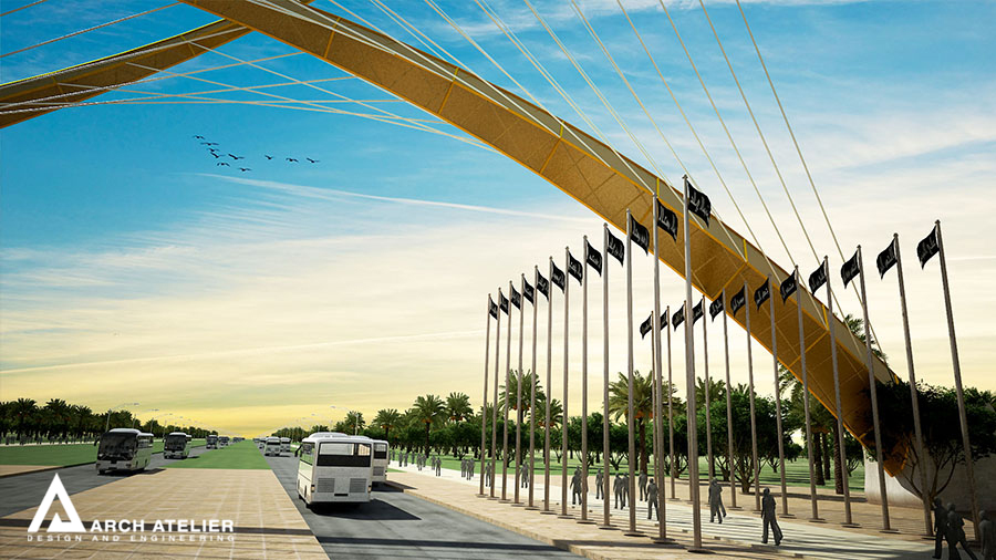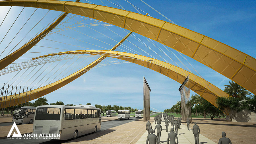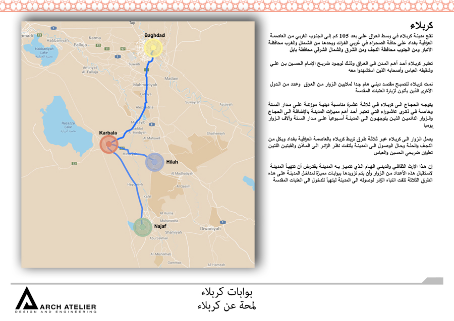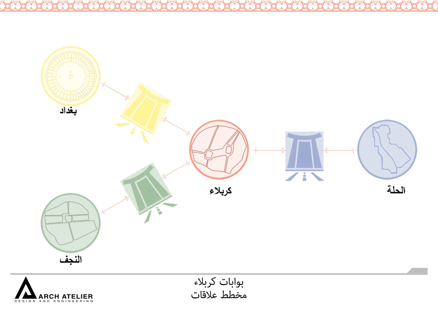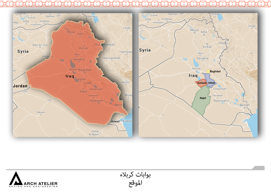 The project is located in Karbala which is one of the most strategically important cities in the mid-south Iraq. Its importance emanates from the existence of the Shrines of Imam Hussein and his brother Abbas. The city is characterized by the vast number of pilgrims heading to the Holy Shrines on 13 specific religious occasions distributed throughout the year, which is attended by the millions annually. In addition, there are the regular pilgrims and visitors weekly throughout the year, not to mention the daily visits by several thousands of people. The unique cultural and religious heritage of the site with its strategic importance ensures that this inflow of people will continue to grow in the future, and hence the need for a well-studied solution that addresses and takes into consideration the existing structure and to also radically respond to the challenges the city expects to face in the future. For that we studied three main gates to the city the first one is in Bagdad, the second in al Najaf, and the last one in al Helleh.