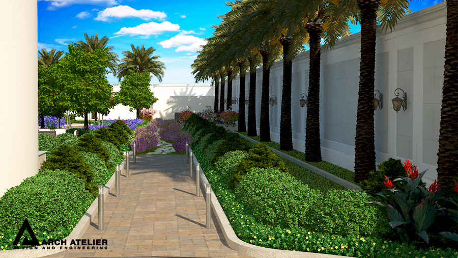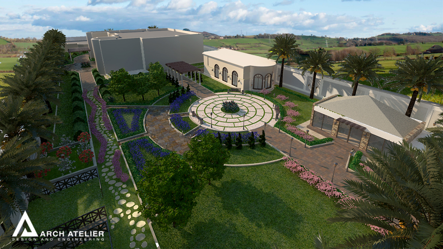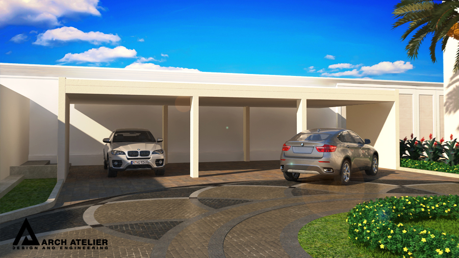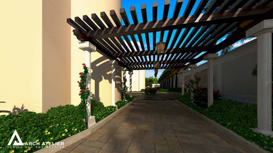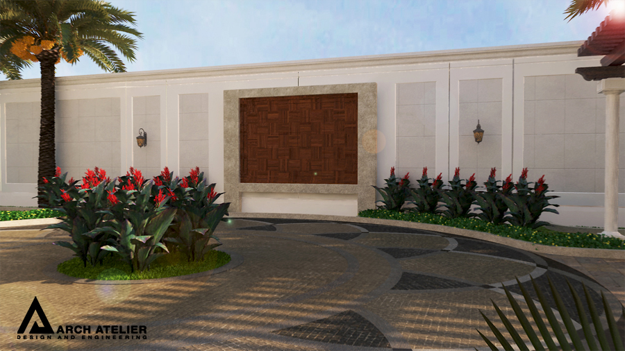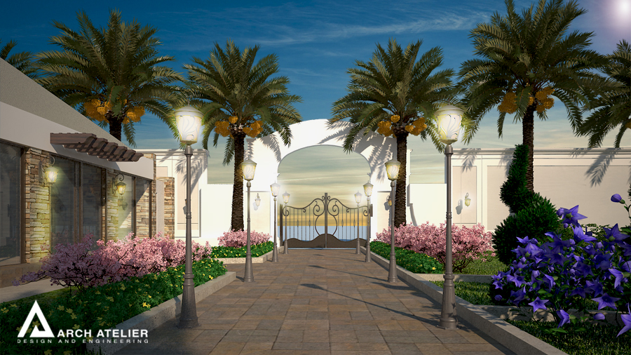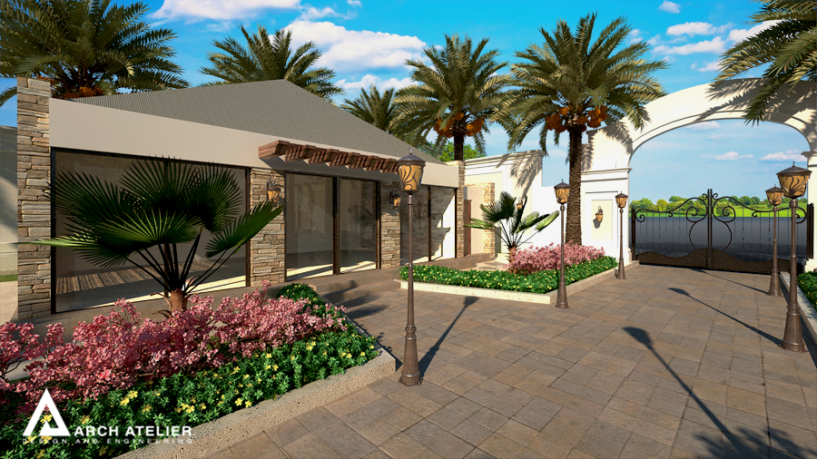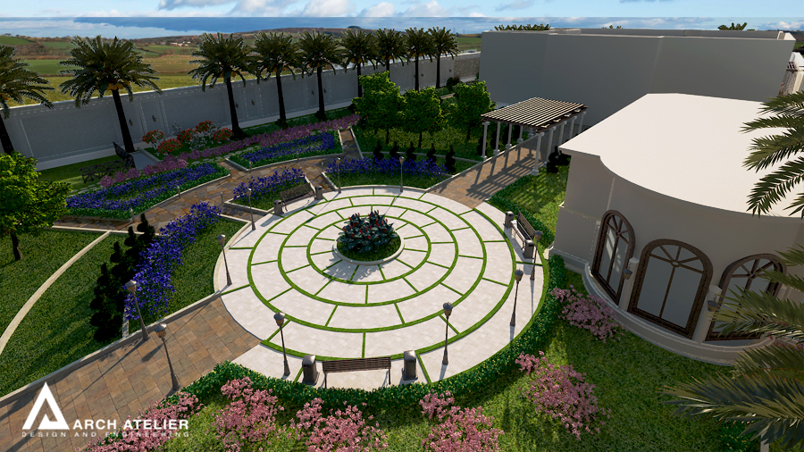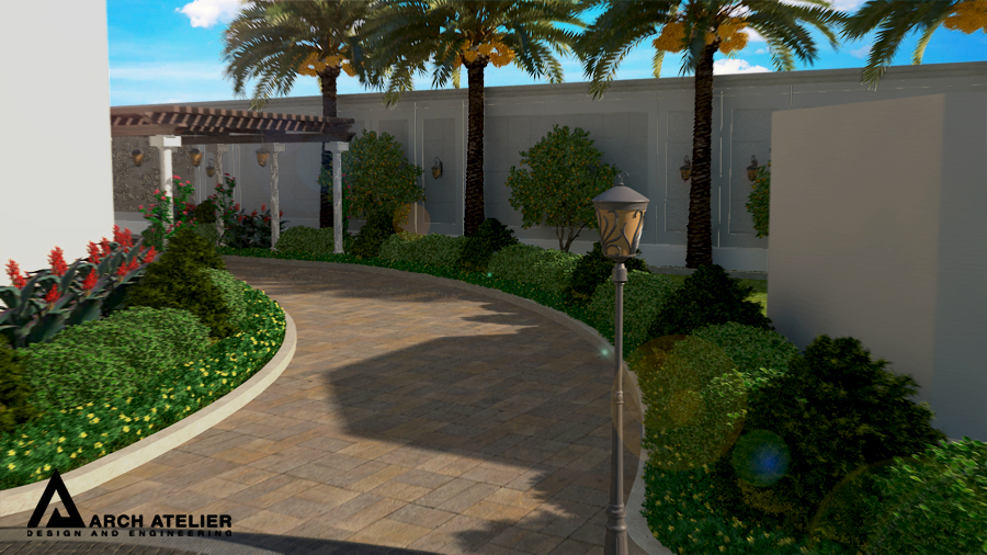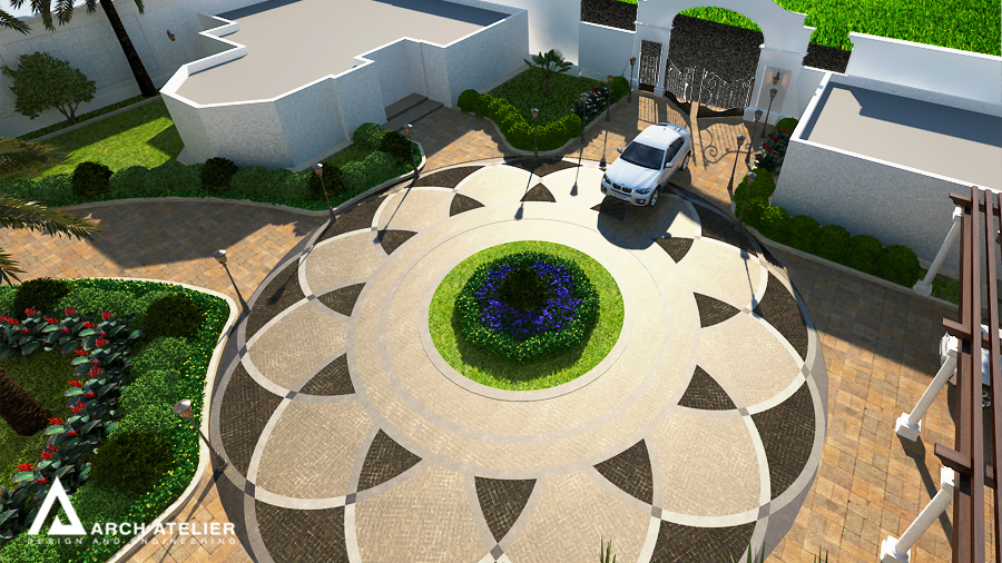 We studied this landscape to fit the main configuration of the villa, so we put three main circles, two of them aligned with the two entrance axes of the villa while the third in the center of the backyard. These three circles are linked to each other by several paths paved with different types of tiles. The landscape includes many gathering spaces, sitting areas with sunshades , swimming pool , decorative walls and a shadowed parking at the entrance.