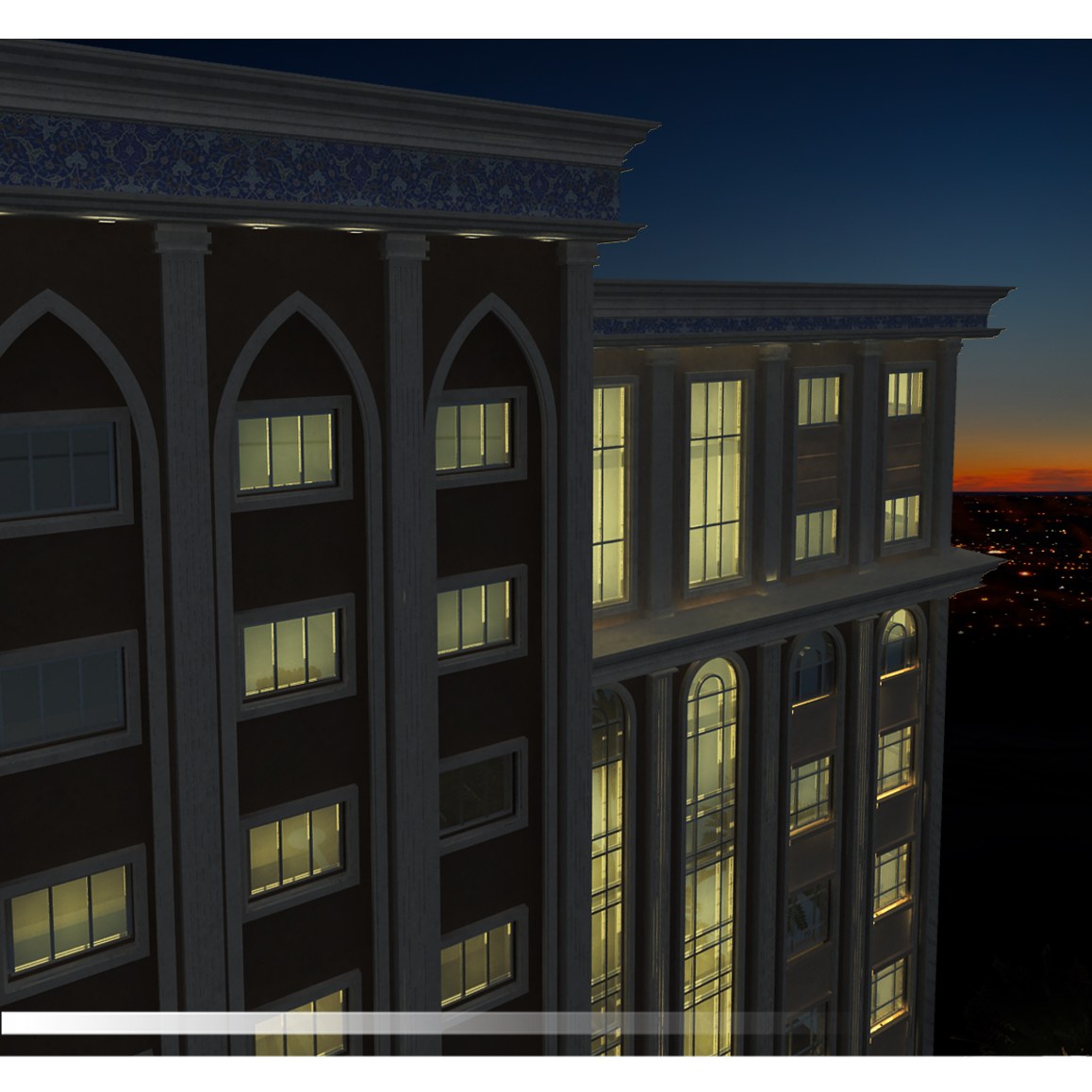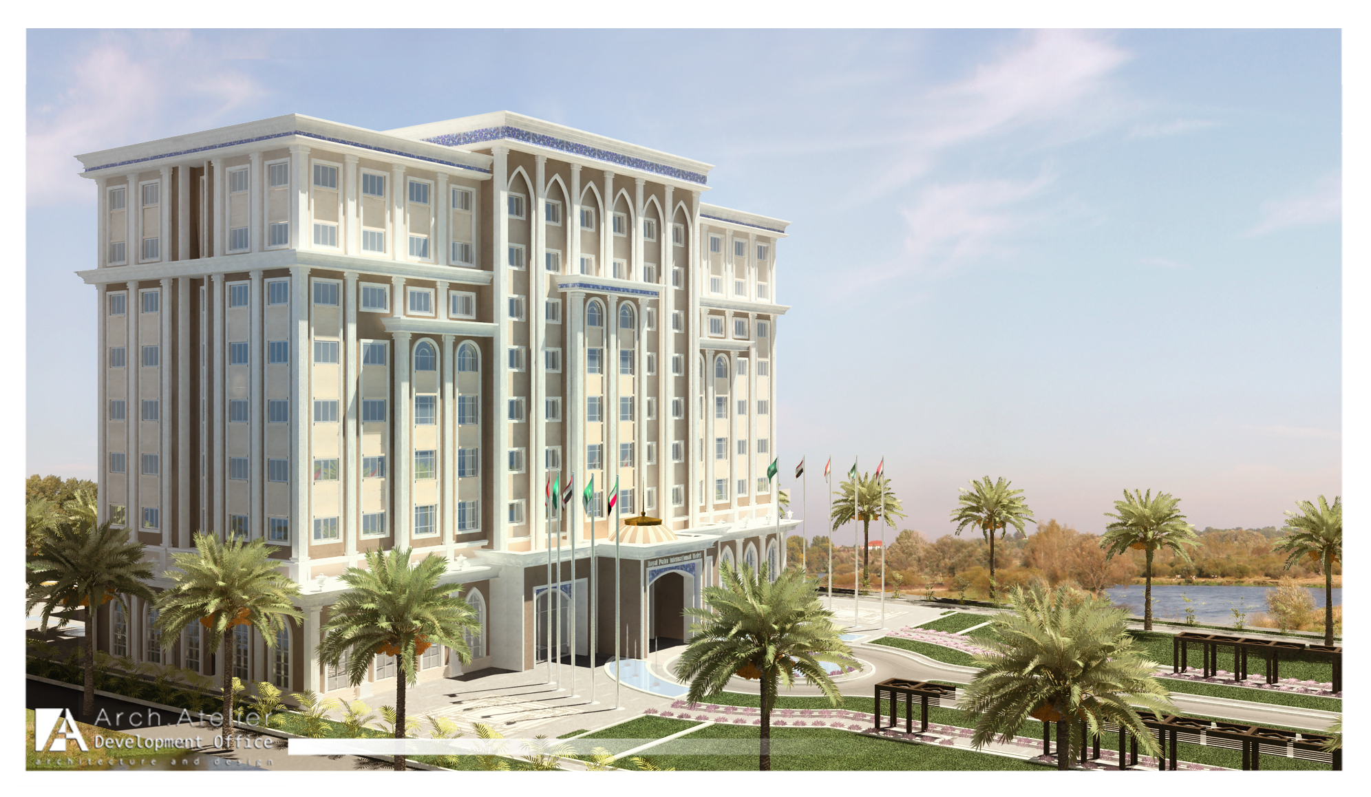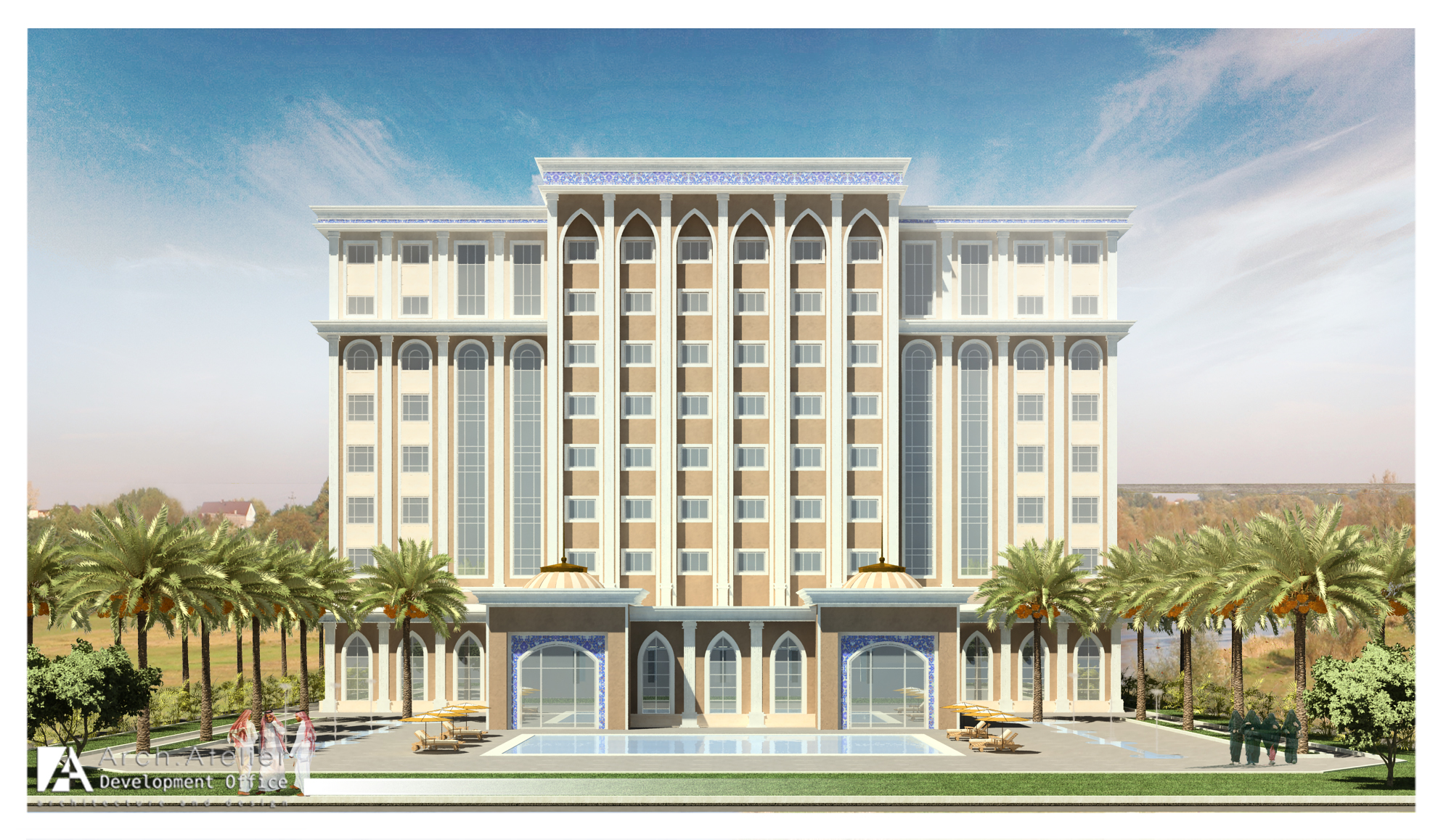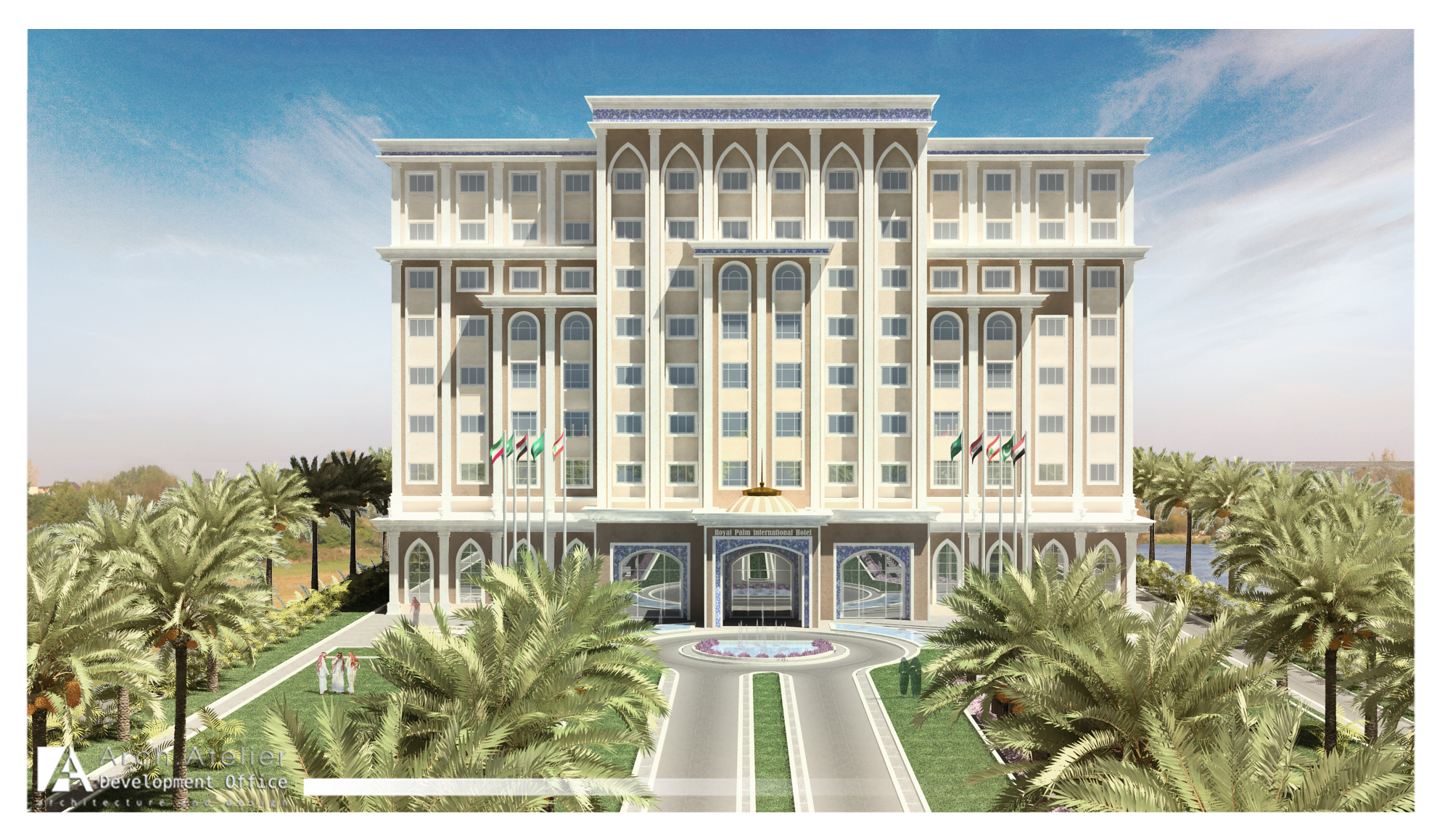 Situated in Jeddah, KSA, the palm hotel is a modern building of 16 rooms distributed into eight floors with a main reception hall and a swimming pool in the ground floor. The rooms are classified in three types: A (suite), B (double rooms), C (single rooms). The project is marked by the use of Islamic architectural elements on the facades and by its integration into the location through a main central road in the middle of the landscape surrounded by wide green areas, several sport spots and many kids’ playgrounds.