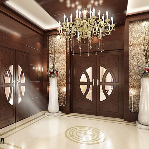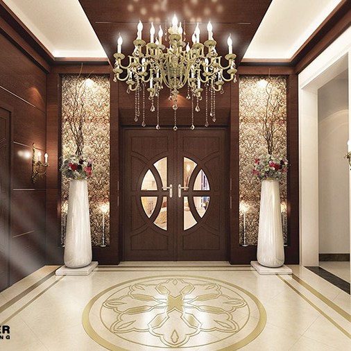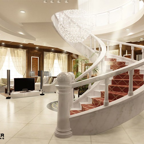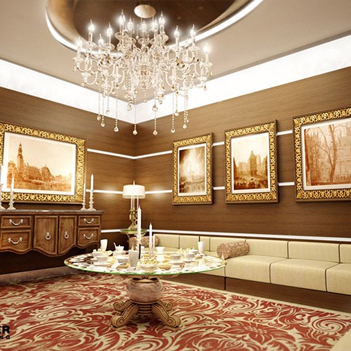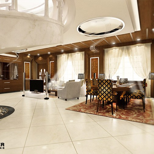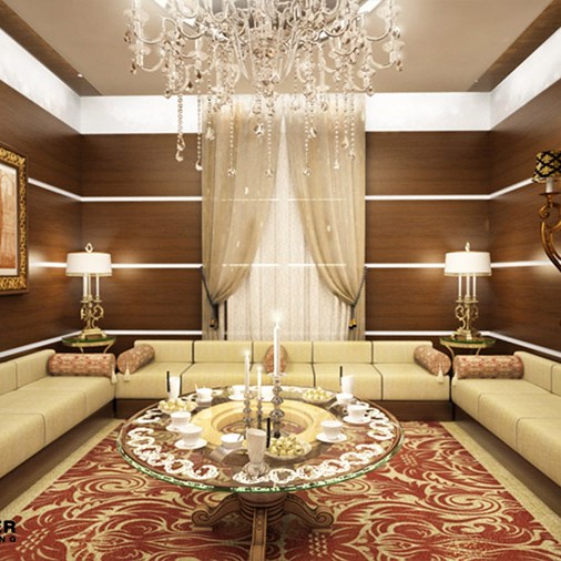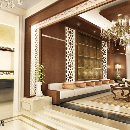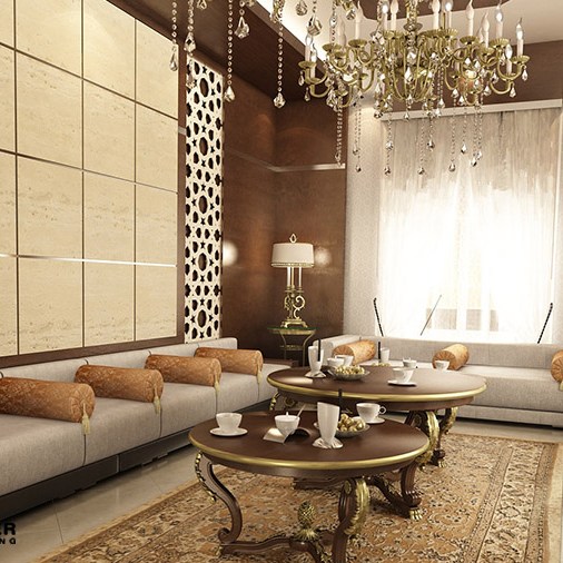 Our intention was to create a luxury villa which reflects simplicity and elegance. We took our inspiration from the traditional architecture prevalent in that region, this can be seen through the configuration of spaces where we adopted openness, through colors we used like light beige, nuts brown for the furniture and the gypsum moldings in the ceilings, and also through wall decorations and reappearing patterns. We also made our design unique by adopting classical elements such as traditional Arabic furniture in the sitting room.