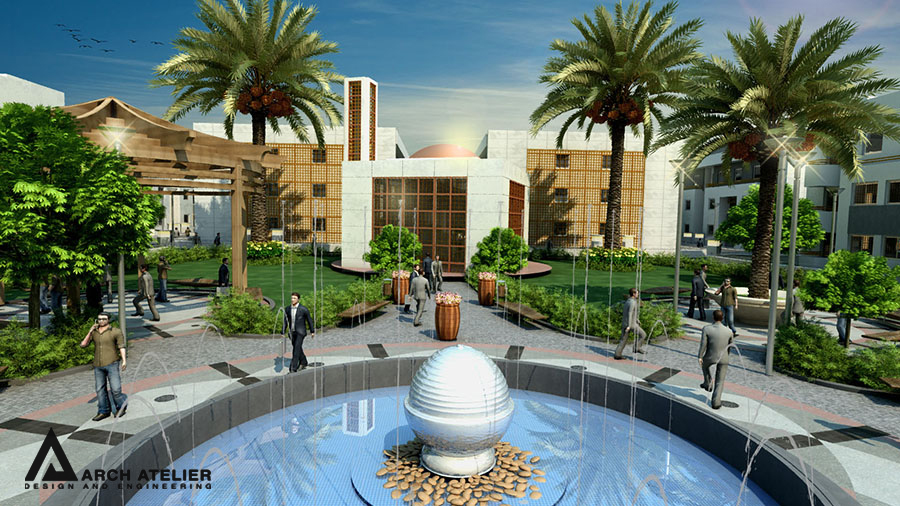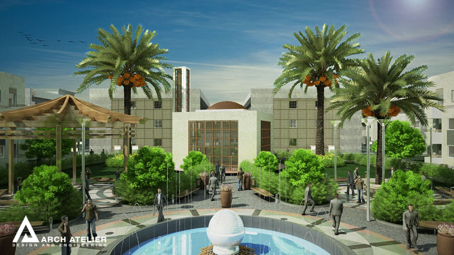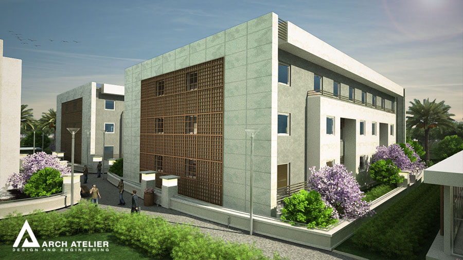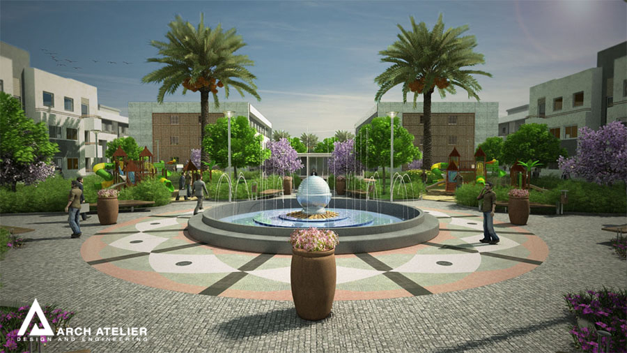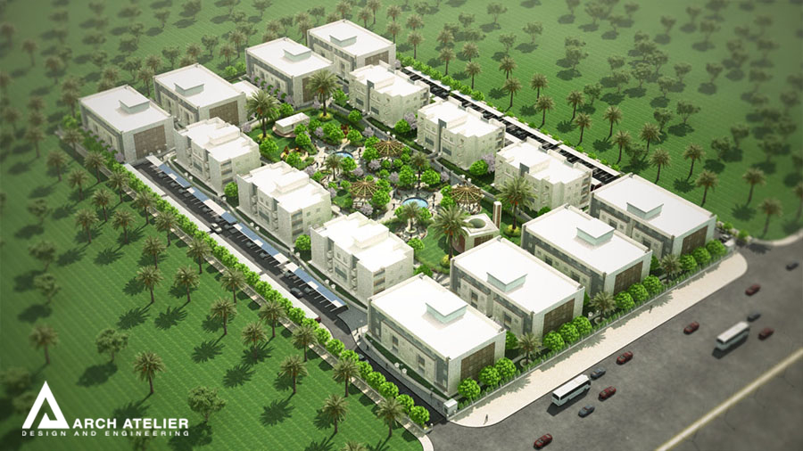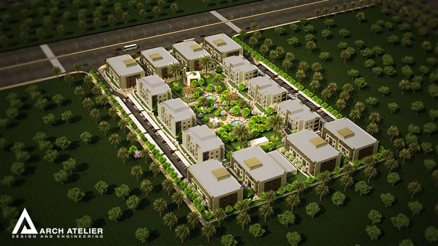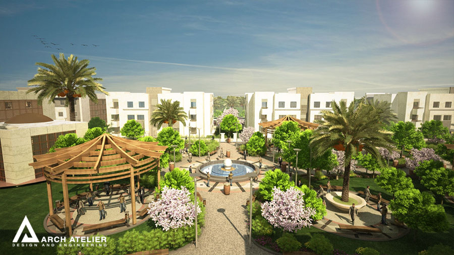 The project is located in Al Najaf, Iraq, it consists of 14 buildings that can accommodate 168 families and are located around a central park with wide green areas, gathering spaces, kids play grounds, stores and a parking for 200 cars. We provided several types of apartments with different floor areas to accommodate for different needs. The apartments were distributed on two types of buildings; each was composed of eight floors with six apartments in each floor. We used elements of the classical architectural style and transformed it to fit the contemporary life style nowadays.