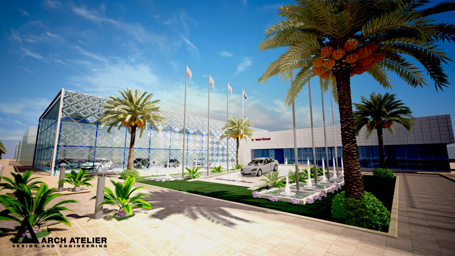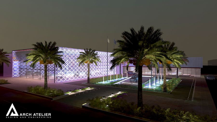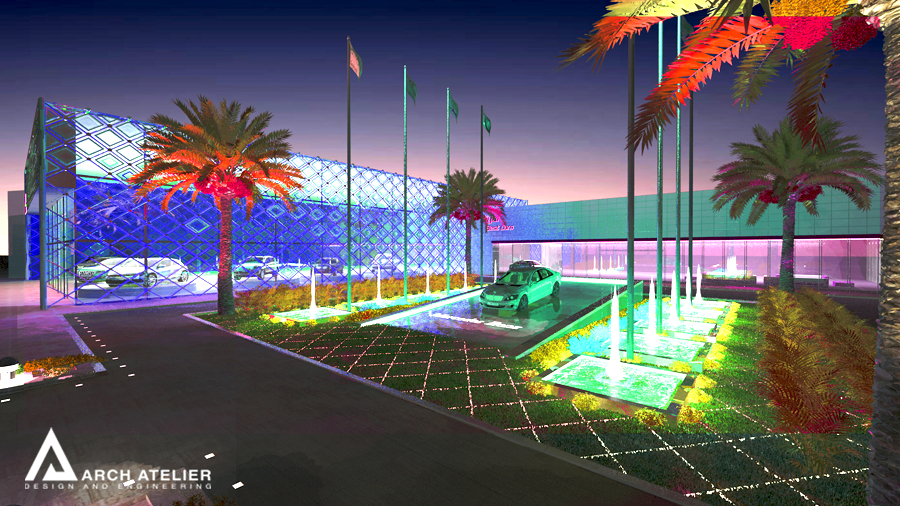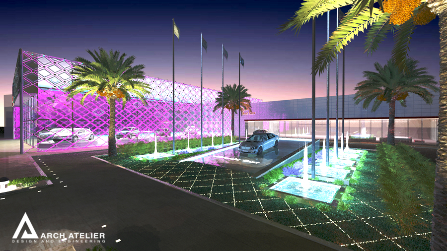 The project is located in Al Dammam, KSA. The challenge of this building was to achieve a perfect way to display cars while maintaining good connection with the outside environment to attract customers. So we responded to the challenge by using wide glass facades, appropriate lighting, and a shell of repetitive pattern on the façade to protect the building from the heat of the desert weather. The pattern of the facades was also used in the landscape to achieve a good connection between the building and its surroundings.