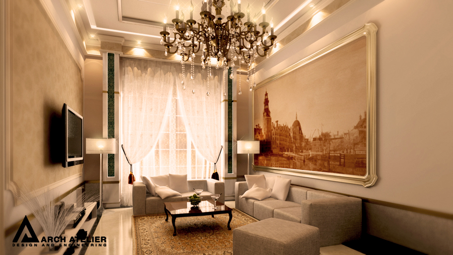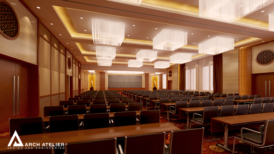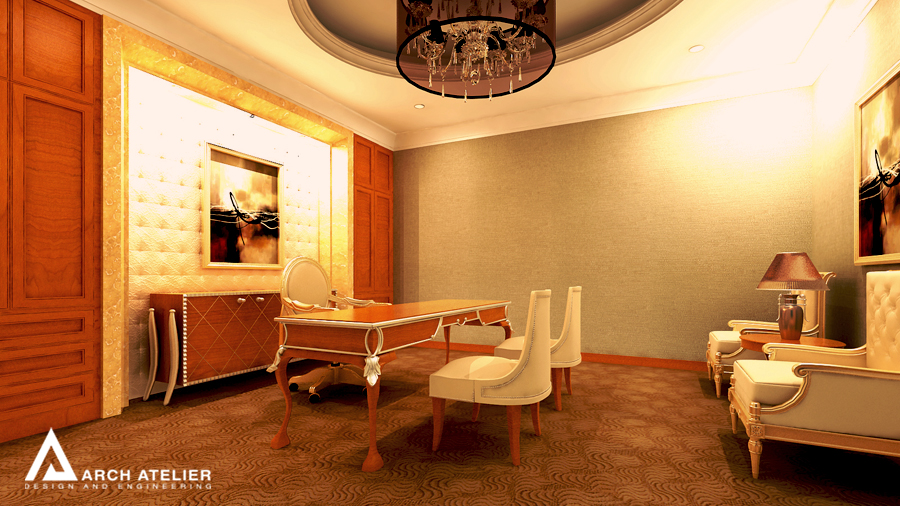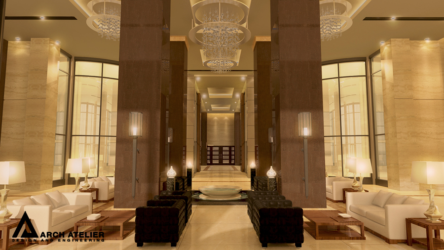 The goal of the design is to create an innovative and dynamic environment, this is achieved through an open and flowing configuration of space; the big high lobby; the warm lighting in the ceiling and the fixtures; the classical warm colors of the furniture and the materials. To give the lobby more luxury we used a pattern in the reception with hidden lights. For the guestrooms we designed them to be modern, comfortable and luxurious at the same time; we achieve that by using classical pieces paired with slightly contemporary setting, classical colors such as beige and off white, and by using wooden furniture and simple gypsum moldings in the ceilings as well as reappearing patterns in walls decorations.