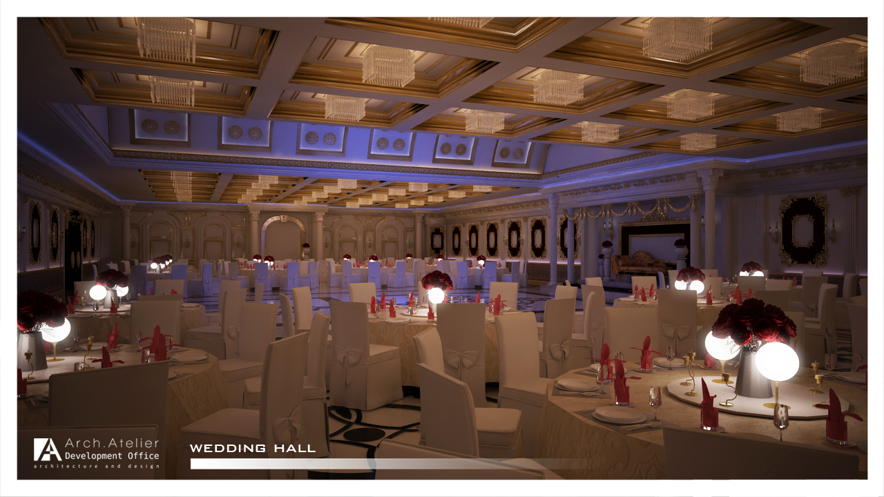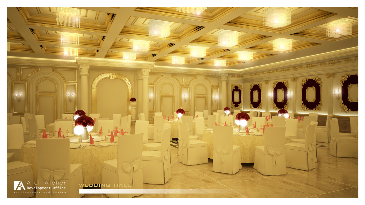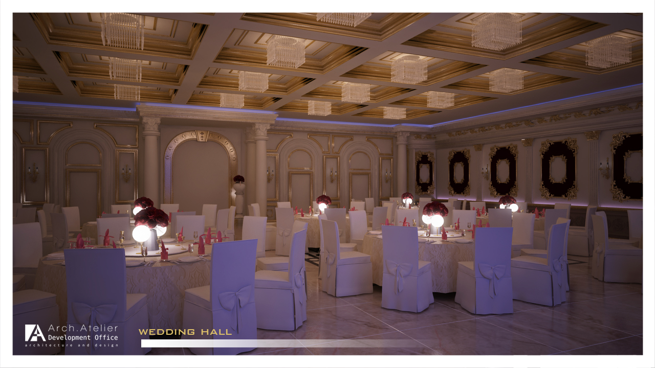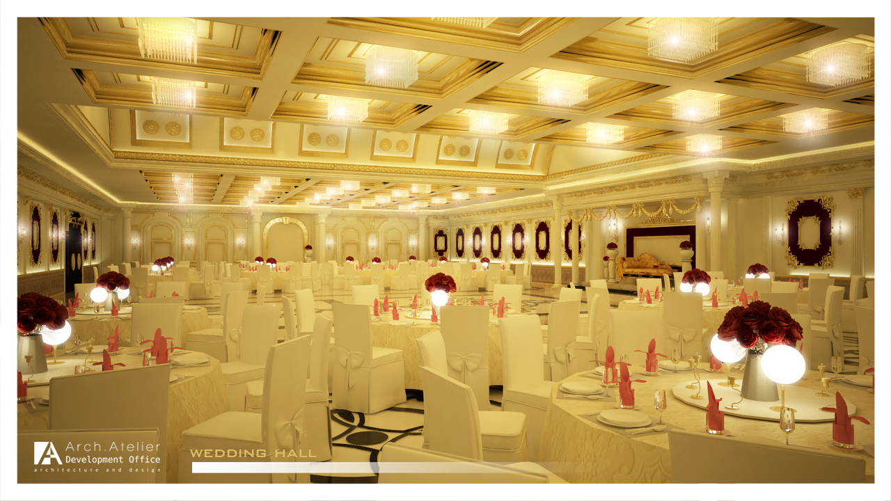 The Wedding Hall is located in the northern part of the capital Damascus … Hall was designed so that it can be divided into three sections depending on the number of people and where it remains for each hall its own podium … Colors that have been chosen are gold and white with touches of russet.