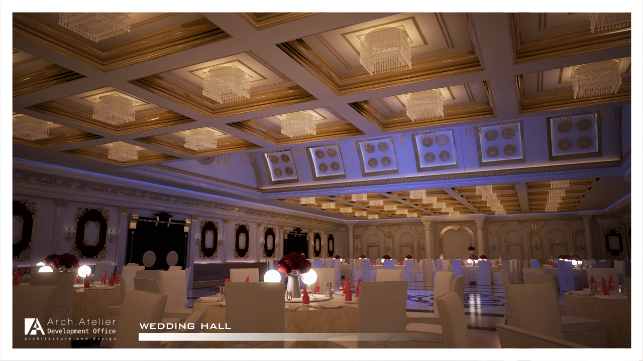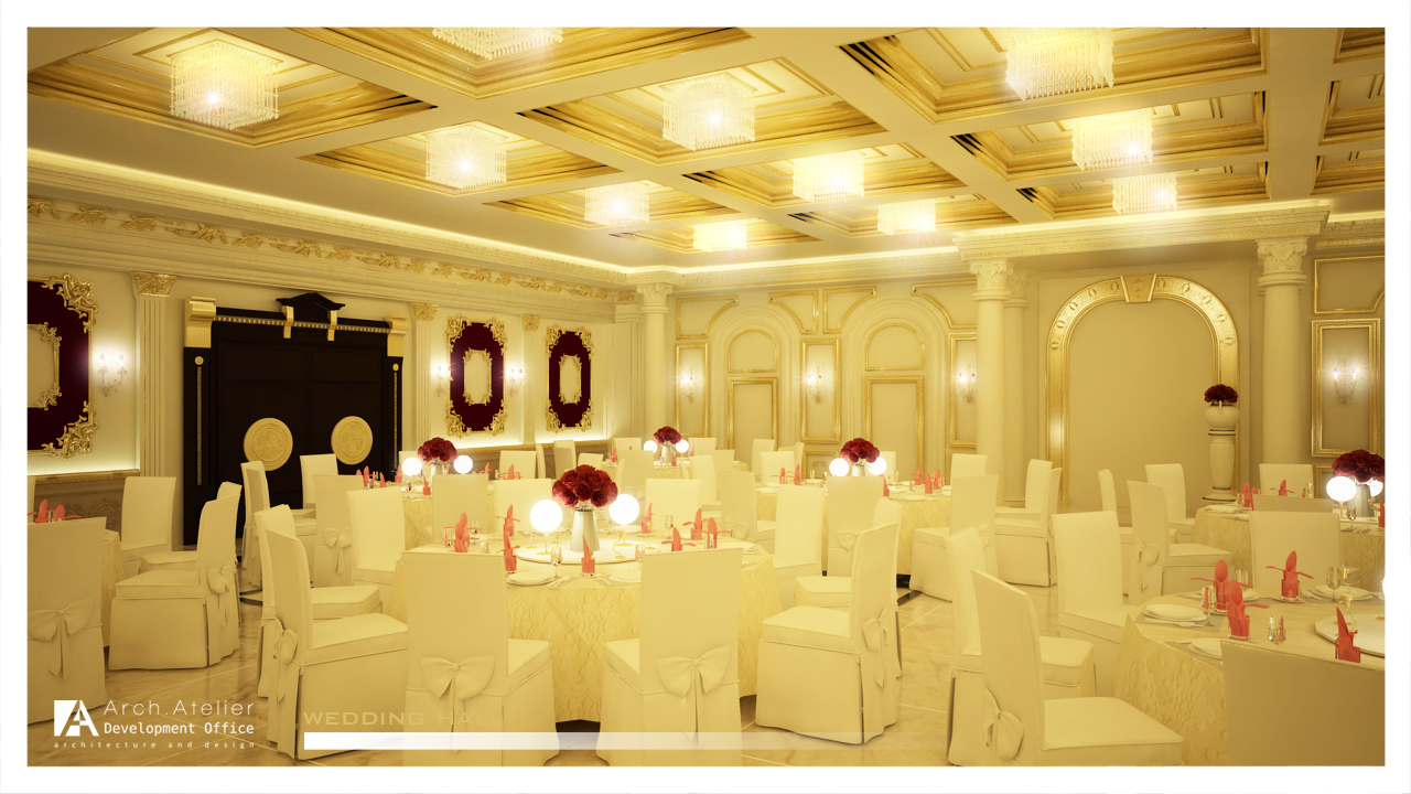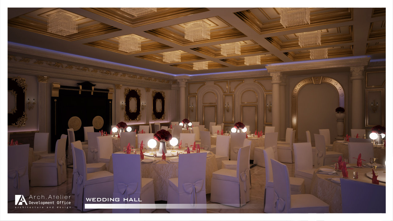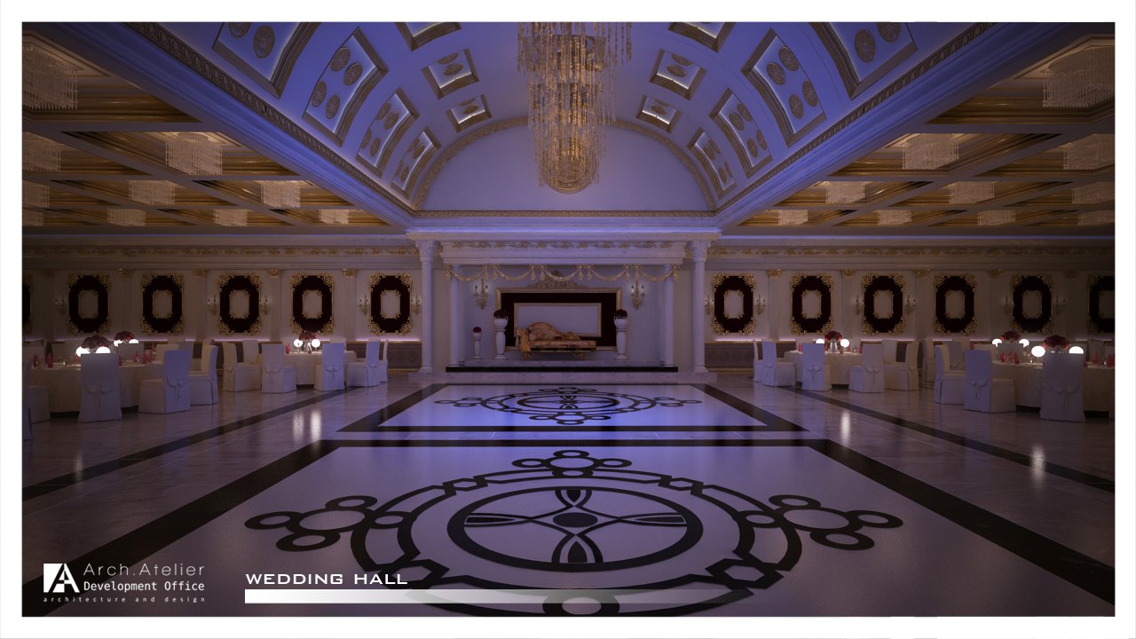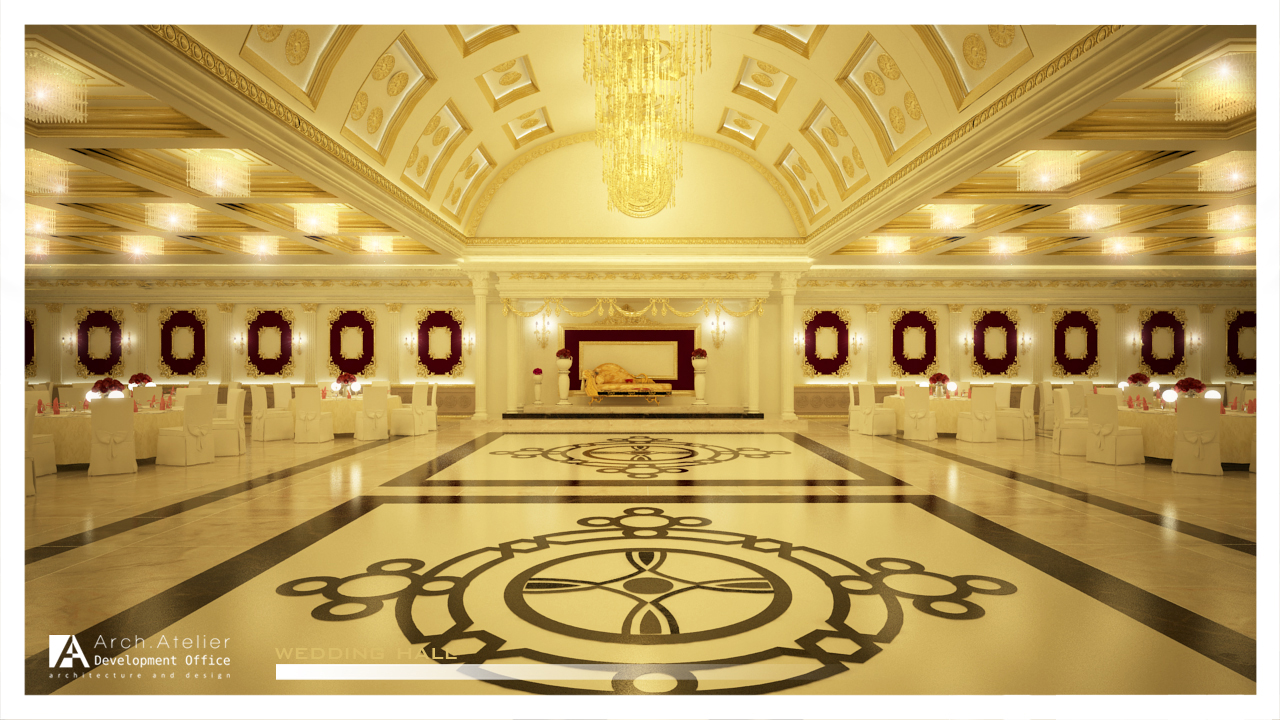 The Wedding Hall is located in the northern part of the capital Damascus … Hall was designed so that it can be divided into three sections depending on the number of people and where it remains for each hall its own podium … Colors that have been chosen are gold and white with touches of russet.